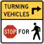 R10-15a | Turning Vehicles Stop for Pedestrians | ? | How to indicate that only turning vehicles must come to a full stop in front of the crosswalk? |