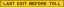 | W16-16aP | Last Exit Before Toll (2-line plaque) | highway=motorway_junction at the exittoll=yes past the exit