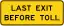 | W16-16P | Last Exit Before Toll (1-line plaque) | highway=motorway_junction at the exittoll=yes past the exit