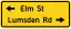 | W16-8aP | Advance Street Name (2-line plaque) | name=Elm Street on cross street at leftname=Lumsden Road on cross street at right