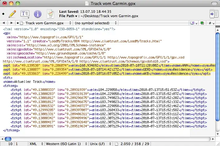 - Track-Datei aus dem Oregon (die heißt zuerst "current.gpx", nach dem Abspeichern dann "name.gpx") mit dem Freeware-Editor "TextWrangler" (http://www.barebones.com/products/textwrangler/) öffnen.