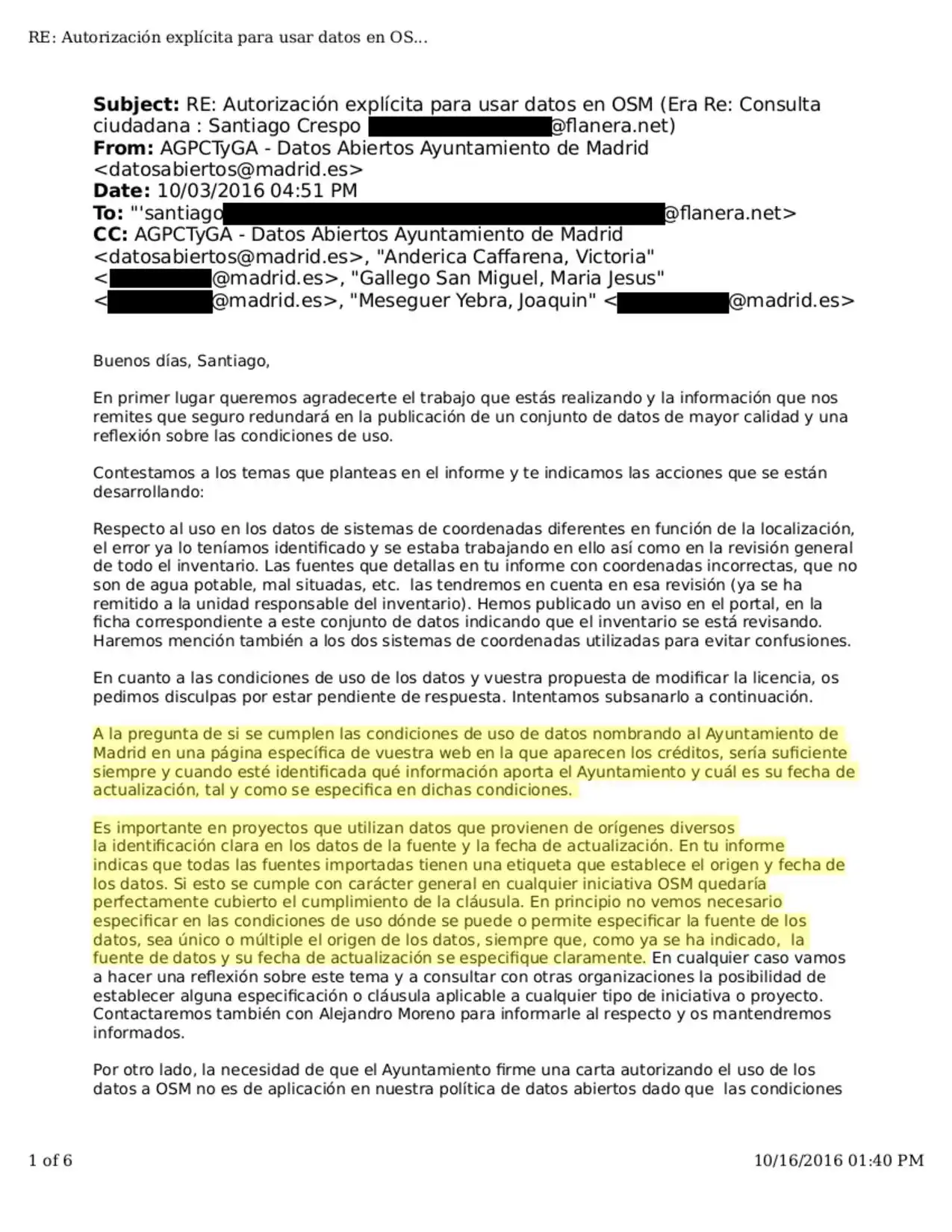 After sending the report with the problems and errors found during the drinking water import, including a section about the license, got a response from the "Subdirección General de Transparencia del Ayuntamiento de Madrid" (the data owner), and they confirmed me that we comply with their attribution clause using their data in OSM if we clearly specify the source and the source:date, the way it was done on the Madrid_Drinking_Water_Import. And they do like the work we are doing :) Kresp0 (talk) 13:30, 16 October 2016 (UTC)