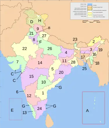 Note: Telangana is effectively number 29 on this map, out of normal alphabetic order of states names in English. Union territories are indicated by letters.