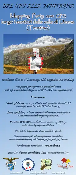 Un mapping party in montagna. Passeremo due giornate in valle del Chiese in Trentino: sabato 30 giugno introduzione all'uso del GPS, breve raccolta dati e presentazione del progetto OpenStreetMap (evidenziando gli aspetti relativi all'utilizzo dei GPS in montagna) e la seconda a gruppi in val di Daone (porta d'accesso da sud alla catena montuosa dell'Adamello) a registrare i vari sentieri. In serata ci si ritrova tutti insieme per inserire i dati in OpenStreetMap. Venerdì 7 giugno presso sala Antonio Pedrotti nella Casa della SAT in Via Manci 57 a Trento è organizzata una serata introduttiva all'uso del GPS in montagna. Il Mapping Party è un evento durante il quale esperti e neofiti assoluti si ritrovano per mappare in compagnia quanto più possibile di un luogo. Una sessione di mapping consiste nel dividere un'area tra i partecipanti e tracciarne la mappa. Nel nostro caso ci si muoverà per gruppi su sentieri di montagna di varia difficoltà.