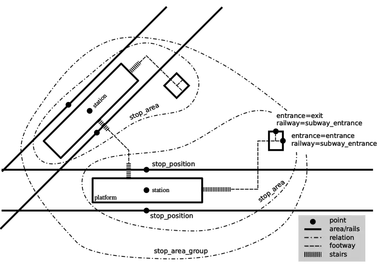 Of these objects, only the station node is mandatory for each station. Also, if possible, mark the subway entrance points, so routers won't bring people to an overground location of an underground station.