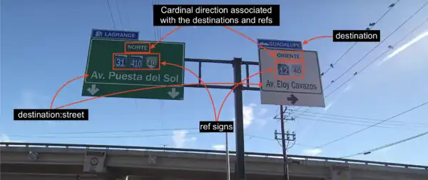 These are some examples, based on the above image from Monterrey, of tags that can be used to precisely reflect destinations and refs seen on signposts.