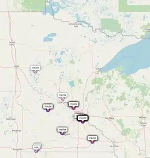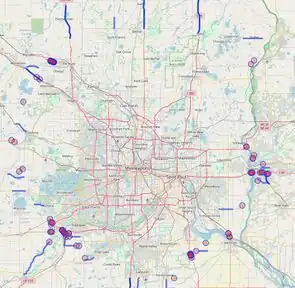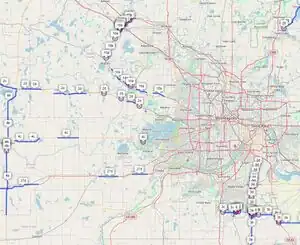 The MN_metro=* key applies to the entire boundaries of the entire set of cities at the perimeter of the metropolitan area. A much smaller definition of the edge of a metro area might also be useful (it is in the process of being rolled out and there is no feedback on its actual usefulness yet). This key is related to the MN_metro_spoke=* key below. While the spoke key shows which highways enter the metropolitan area, this key shows the boundary sections where the highways enter. As such, this key is a very small subset of the MN_metro=* key. It shows only the outside edge of the edge cities, and only shows edges that have highways crossing the edge. The results are not pretty, but it might be useful while editing a road that enters the metropolitan area to have a visible clue about when you should be thinking about whether to follow specific metro guidance instead. Currently the edge tagging decision was based only on highway=* for motorway, trunk, primary, or secondary.