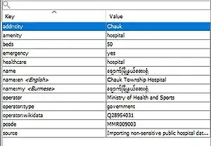 - source field "Importing non-sensitive public hospital data from MIMU, ESRI", Tips: If you want to filter in JOSM use this source field.