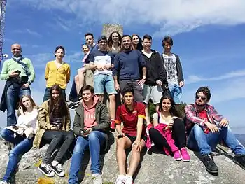 Students from four countries came together for a Comenius school project MychOSM preparing field research on historical and geographical sites. This A0 print of OpenStreetMap was made using Mapwebbing. | Students on top of Monte Santa Trega a "Nacional Vértice Geodésico" most of them with OSMTracker ;-) |