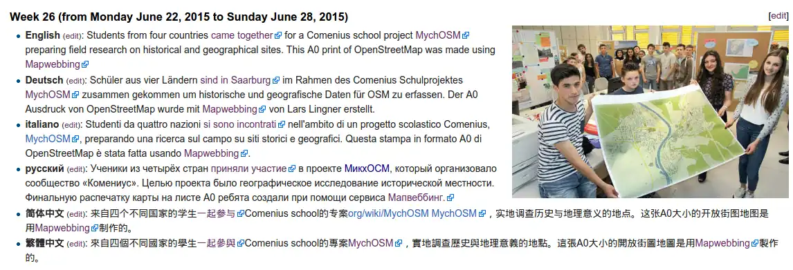 My community and my history in OpenStreetMap will also contribute to this blog, from which various messages from the OSM world are publicised to a wider audience. The main source of all our news is translated from the German-language “Wochennotiz“. Our blog has received considerable positive and encouraging feedback from the community; the best response has been from Satoshi IIDA a Japanese mapper, who has offered to translate the weekly OSM messages into Japanese. Now, we are proud to have also a French and Czech version. A version in Bahasa Indonesia and Portugues do Brasil complete the additional translations available until the end of the Comenius project; weeklyOSM will be continued with the support of the OSM community.
