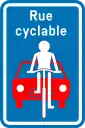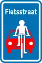 Een bord G11 met de extra aanduiding 'fietsstraat', en een onderbord voor toegestane categorieën. Een dergelijke fietsstraat is juridisch gezien een fietspad met uitzonderingen voor toegelaten gebruik zoals aangegeven op het onderbord.