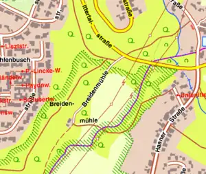 | rot | Öffentliches Gebäude (z.B. Schule, Kirche, Sporthalle, ...) - mitunter auch dunkelgrau dargestellt. |