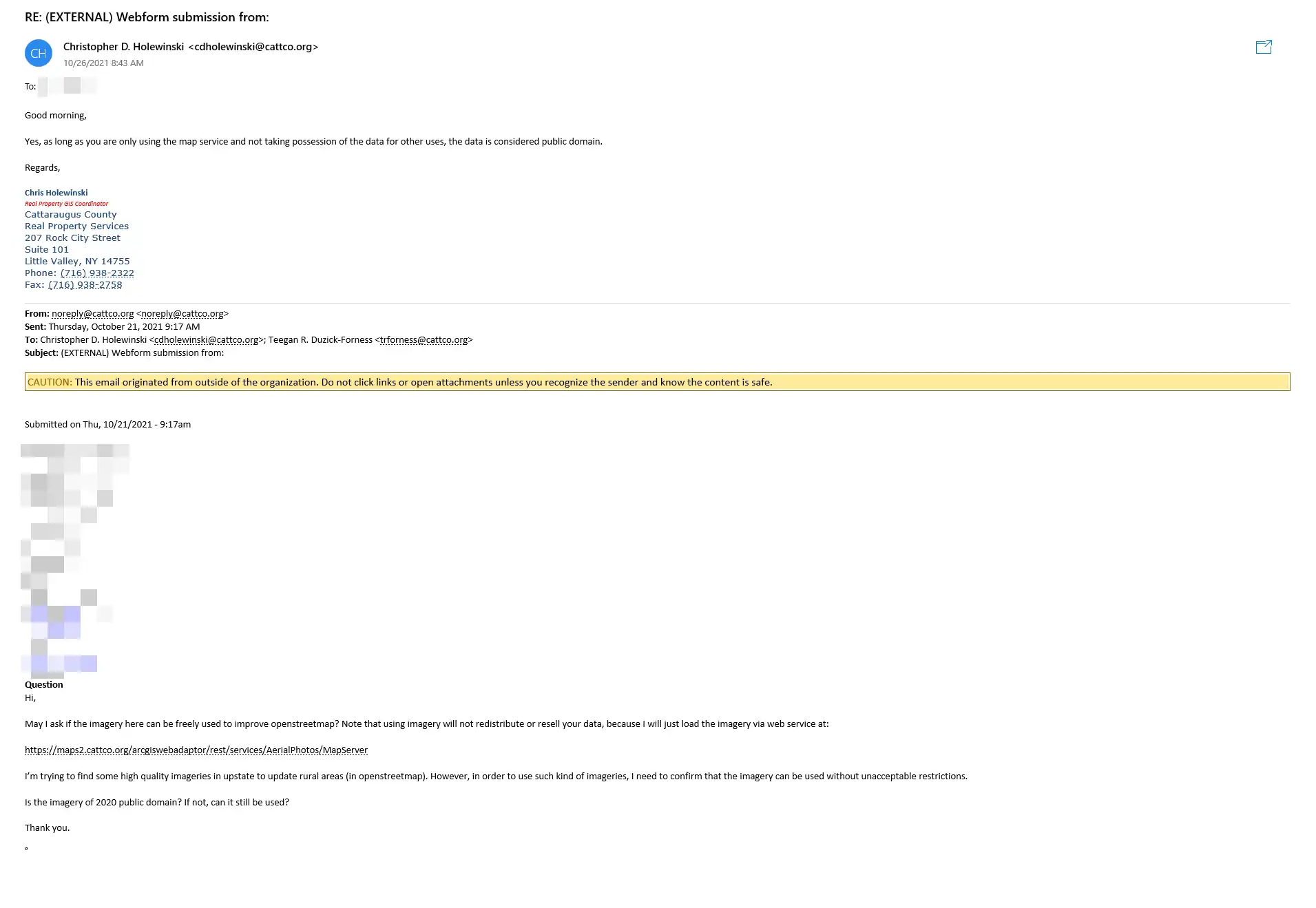 Cattaraugus County GIS Coordinator Christopher D. Holewinski has approved the imagery usage in OpenStreetMap as public domain data. A proof has been obtained and uploaded to the OpenStreetMap Wiki.