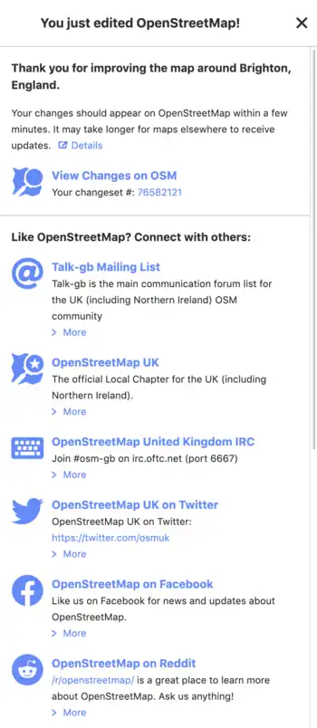 Screengrab from the iD editor after an edit made by a UK editor 2019-11-04 showing display of OSM Community Index data