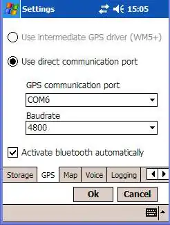 If you are on WM5 or WM6, select 'Use intermediate GPS driver', provided you have already configured windows to use your GPS device. In any other case, specify port and baud rate and tap OK. (For Bluetooth connections, the baud rate is less important, simply choose a big one.)