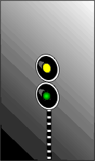 In some stations where the main signal is difficult to see, it's possible to also have a departure indicators, composed of 2 vertical white lights that turn on when the main signal state allows the train to pass it. The train can pass this signal even if not lit.