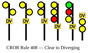 | 408 | Clear to Diverging | Proceed, approaching next signal at DIVERGING speed.