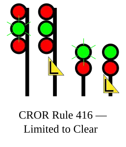 | 416 | Limited to Clear | Proceed, LIMITED speed passing signal and through turnouts. |