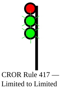 | 417 | Limited to Limited | Proceed, LIMITED speed passing signal and through turnouts, approaching next signal at LIMITED speed. | ![]() |