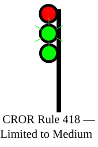 | 418 | Limited to Medium | Proceed, LIMITED speed passing signal and through turnouts, approaching next signal at MEDIUM speed. | ![]() |