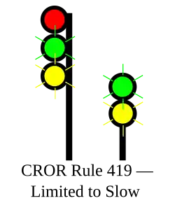 | 419 | Limited to Slow | Proceed, LIMITED speed passing signal and through turnouts, approaching next signal at SLOW speed. |
