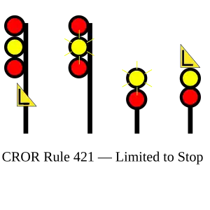 | 421 | Limited to Stop | Proceed, LIMITED speed passing signal and through turnouts, preparing to stop at next signal. |