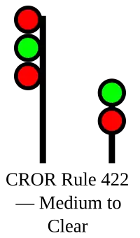 | 422 | Medium to Clear | Proceed, MEDIUM speed passing signal and through turnouts. | ![]() |