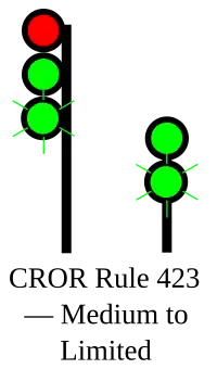 | 423 | Medium to Limited | Proceed, MEDIUM speed passing signal and through turnouts, approaching next signal at LIMITED speed. | ![]() |