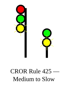 | 425 | Medium to Slow | Proceed, MEDIUM speed passing signal and through turnouts, approaching next signal at SLOW speed. |
