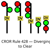 | 428 | Diverging to Clear | Proceed, DIVERGING speed passing signal and through turnouts.