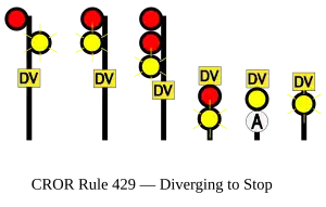 | 429 | Diverging to Stop | Proceed, DIVERGING speed passing signal and through turnouts preparing to stop at next signal.