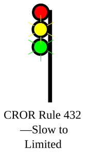 | 432 | Slow to Limited | Proceed, SLOW speed passing signal and through turnouts, approaching next signal at LIMITED speed | ![]() |