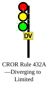 | 432A | Diverging to Limited | Proceed, DIVERGING speed passing signal and through turnouts, approaching next signal at LIMITED speed.