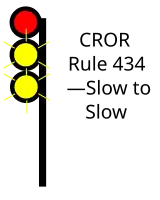 | 434 | Slow to Slow | Proceed, SLOW speed passing signal and through turnouts, approaching next signal at SLOW speed. | ![]() |