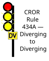 | 434A | Diverging to Diverging | Proceed, DIVERGING speed passing signal and through turnouts, approaching next signal at DIVERGING speed.