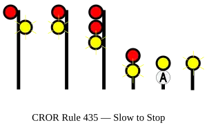 | 435 | Slow to Stop | Proceed, SLOW speed passing signal and through turnouts, preparing to stop at next signal. |