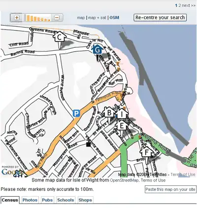 Also had to determine the dimensions of the generated map for each zoom level. At level 11, the Isle of Wight covers 4 x 3 tiles; each GMaps tile is 256 x 256, so the total map dimension is 1024 x 768. Each zoom level doubles the width and height, so at level 12 it's 2048 x 1536, etc.