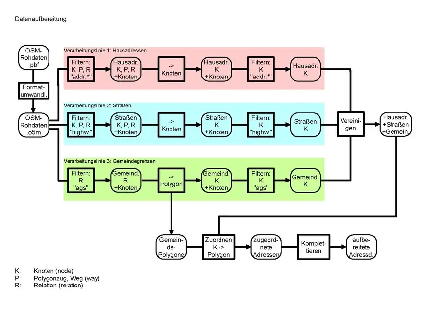 The actual geocoding algorithm needs to be based on data structures which allow fast access to all the information required. The data preparation converts OSM raw data and writes them into these structures. The generated file has .ogb (OSM geobase) format.