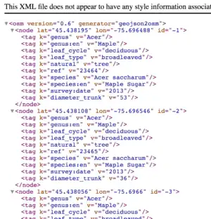 The KMZ format had tags that are not usable in an OSM format and thus had to be cleaned and modified with proper OSM tags. All that remains from the source data is the width, object id number, and common name of species.