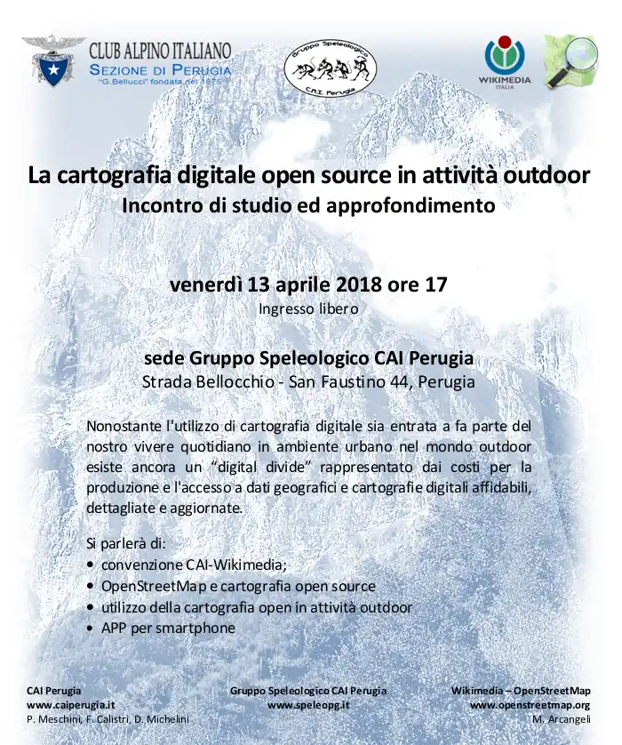 La sezione CAI di Perugia "G. Bellucci", in collaborazione con Wikimedia Italia, organizza un incontro informativo per la diffusione della cartografia digitale open source in ambiente outdoor.