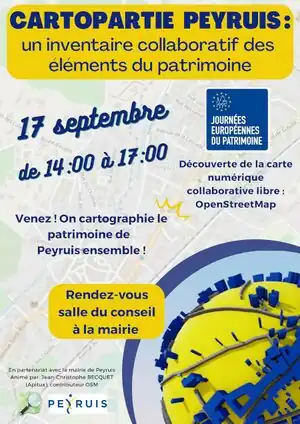 La ville de Peyruis vous invite à participer à la Cartopartie organisée samedi 17 septembre 2022. Cet événement s'inscrit dans la programmation des Journées Européennes du Patrimoine. Rendez-vous dans la salle du Conseil, Place de l'Hôtel de Ville de 14h à 17h.
