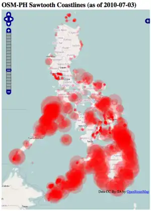 Practically all of the coastlines of the Philippines were imported from a crude coastline shapefile generated from SRTM data back in 2007. The problem with SRTM data is that it has a resolution of about 90 meters and since the data is in a raster format (i.e., pixellated), the coastlines therefore appear as jagged "sawtooth" shapes.