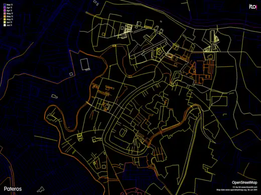 Pateros Mapping Party editing activity. As seen in this ITO World's OSM Mapper visualization, practically every object in Pateros was edited as a result of the Pateros Mapping Party.
