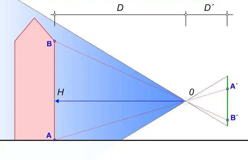 If you make a photo orthogonal to the facade, you can get not only the texture, but also determine the dimensions of the photographed object. Knowing the values of D and D'(see further in the text), the dimensions can be calculated directly from the image.