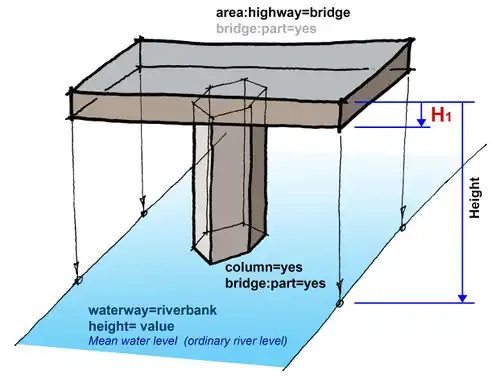 column=yeslubpillar=yeslubbarrier=wallzarea=yes(proszę o głosowanie)bridge:part=yeslubbuilding:part=yes(proszę o głosowanie)- jak tagować wartość H1? (grubość głównego plateau mostu):