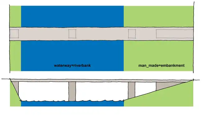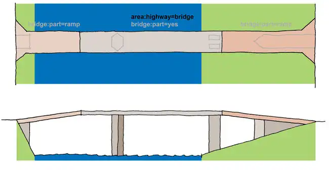 Zastosowanie koncepcji obszaru mostu pomaga renderować lepsze mapy 2D, zobacz man_made=bridge