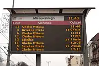 | Tablica na przystanku, dworcu, stacji lub lotnisku pokazująca informacje o odjazdach lub odlotach. |