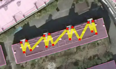 Fakt, że jeden fragment dachu nie pasuje do drugiego nie oznacza, że teren na którym jest budynek jest nieprawidłowo połączony (jakkolwiek zdarzyć się potrafi, na szczęście rzadko, i to). Zdjęcia dostępne obecnie na terenie Polski są robione zazwyczaj z dużej odległości o można przyjąć ze mamy do czynienia z [[ http://de.wikipedia.org/wiki/Parallelprojektion%7Cprojekcja równoległą]]. Dlatego możemy obrysowywać poszczególne fragmenty dachów i łączyć je w całość.