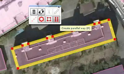 Rysujemy drugą linie konstrukcyjną równoległą do pierwszej (Potlatch2 shortcut "P") Linia ma leżeć na przeciwległej krawędzi budynku. Kopia nie jest rysowana grubo, wiec łatwiej ustalić gdzie powinna się znajdować. NIE przesuwamy tej linii po zrobieniu kopii!