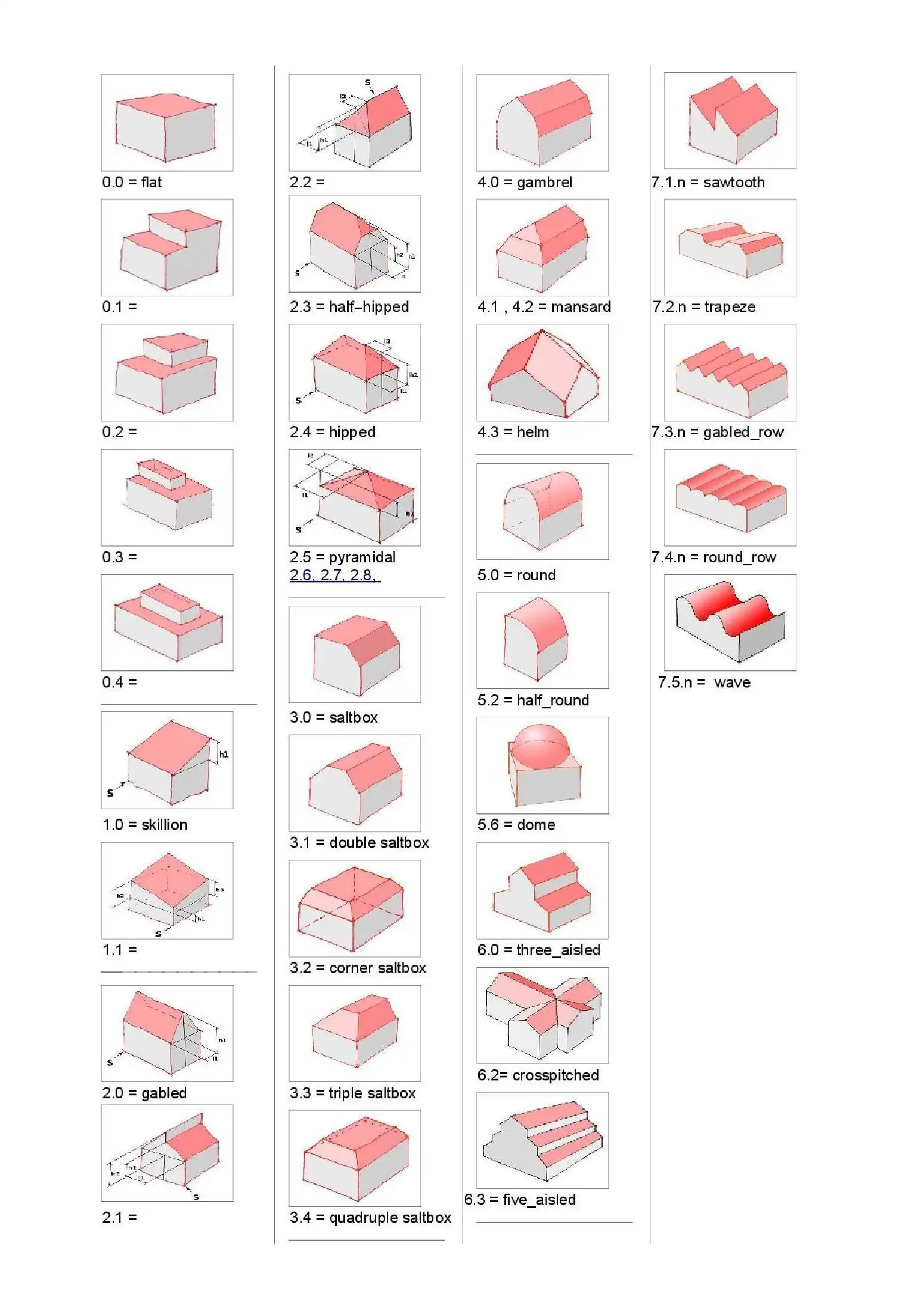 Numeryczny opis niektórych form dachów odpowiada tradycyjnemu opisowi slownemu np. ze strony:Proposed_features/Building_attributes: